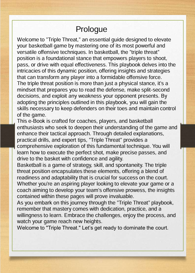 Whether you're an aspiring player looking to elevate your game or a coach aiming to develop your team's offensive prowess, the insights contained within these pages will prove invaluable. As you embark on this journey through the "Triple Threat" playbook, remember that mastery comes with dedication, practice, and a willingness to learn. Embrace the challenges, enjoy the process, and watch your game reach new heights.