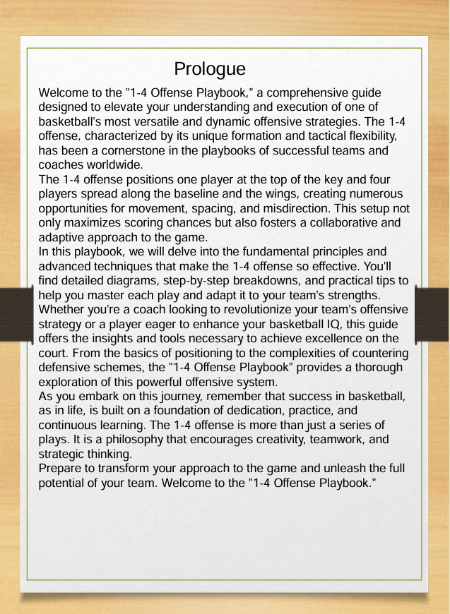In this playbook, we will delve into the fundamental principles and advanced techniques that make the 1-4 offense so effective. You'll find detailed diagrams, step-by-step breakdowns, and practical tips to help you master each play and adapt it to your team's strengths. Whether you're a coach looking to revolutionize your team's offensive strategy or a player eager to enhance your basketball IQ, this guide offers the insights and tools necessary to achieve excellence on the court. From the basics of positioning to the complexities of countering defensive schemes, the "1-4 Offense Playbook" provides a thorough exploration of this powerful offensive system.